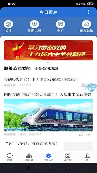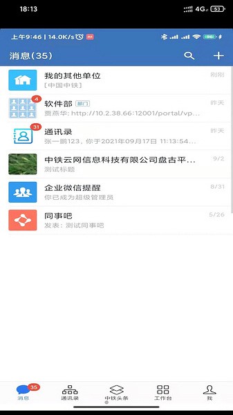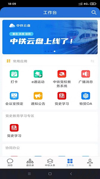 用于中国中铁内部员工办公及沟通,即时通讯、视频会议等需求,并包含了消息推送,中铁新闻展示,一体化办公平台进度通知,组织机构通讯录查询等若干功能。
