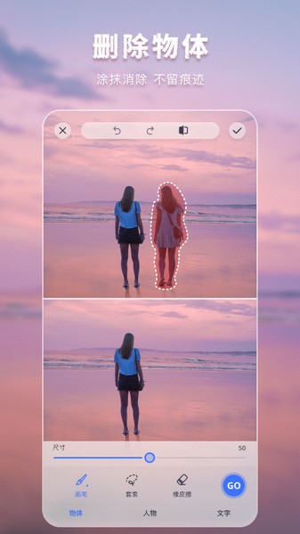 您拍照时不小心把路人甲路人乙也拍进去,影响观感?用我们的app啦,快速把照片中不想要的东西清除掉,还能将人物照片中的斑点瑕疵通通清理掉,方便又实用,使您的美颜照美美哒。