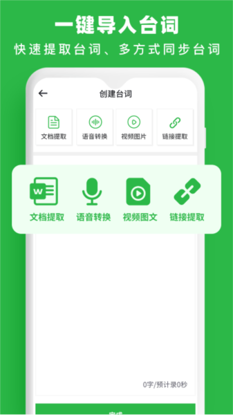 一键导入台词:支持视频、音视频、word/pdf/txt文档、图片、链接等智能转换为剧本,高效导入,轻松拍摄短视频。