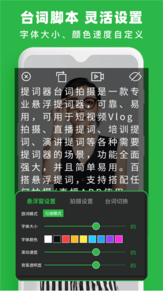 3, 提词设置:自定义背景透明度、字体、播放速度、颜色等多方位设置,满足不同场景需求。
