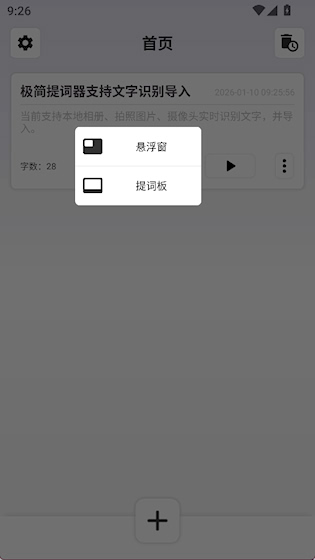 3、点击黑色三角开始提词,有悬浮窗和提词板两种模式