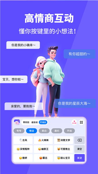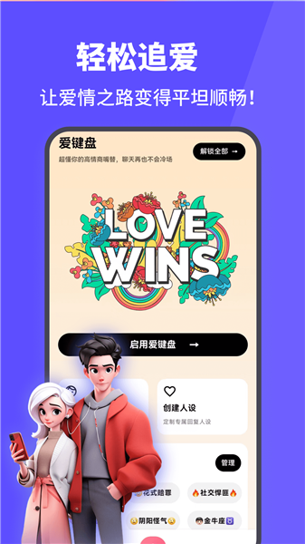追爱键盘输入法是宿州四灵网络科技有限公司开发的一款高情商聊天辅助输入法的生活服务类软件。在软件中用户可以一键生成恋爱话术,切换多种人设,还能润色文字优化表达。软件为用户提供多场景的交流方案,满足用户不同沟通需求,十分人性化。软件内有人设切换、话术库、文字润色等等功能,界面设计简洁,方便用户使用。