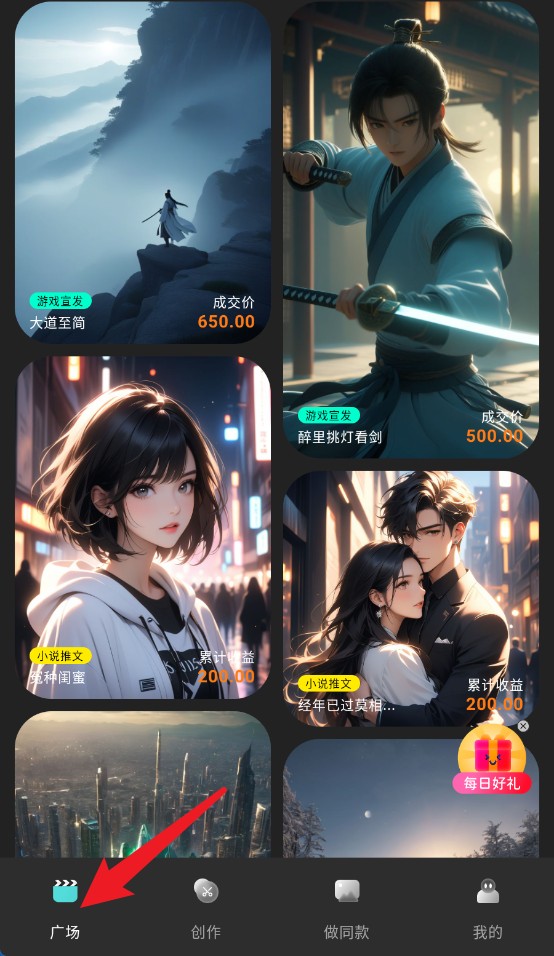 1、广场页面展示各类图文及剧情作品,支持浏览小说推荐和游戏宣发等内容资源。