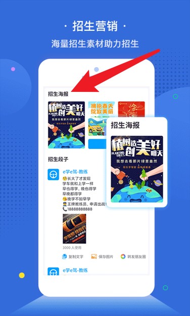 3、招生营销模块提供丰富海报和宣传文案素材,助力驾校便捷开展招生推广活动。