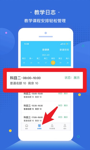 2、教学日志功能展示每日课程安排,支持教师查看每节课时间、状态及报名人数。