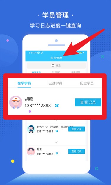 4、学员管理界面可分类查看在学、已过学员信息,支持一键查询学员学习记录进度。