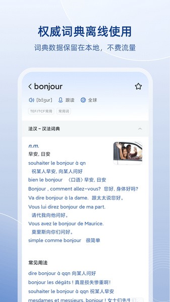 - 拥有与桌面版相同容量的词库。包括了法汉-汉法词典、法语近义词词典、法语专业词典以及法法、法英等大量词库