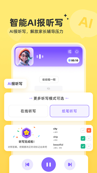 通过在线听写以及纸笔听写模式进行训练,可以随时在线听写练习英语单词;