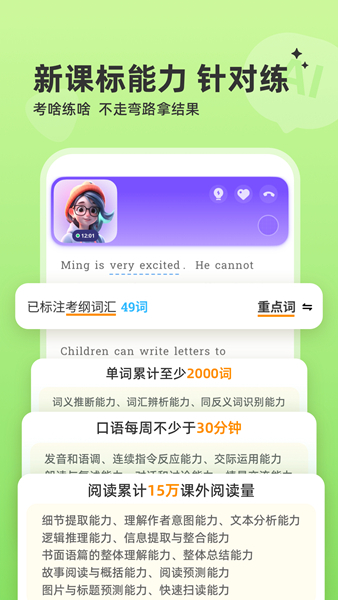 采用可定制化的难度、生词、话题、长短、文体等形式,为孩子量身定制自己的阅读材料,紧贴新课标要求,题型丰富、覆盖兴趣&常考话题,能够全面锻炼学生的听、说、读、写、看等各项语言技能。