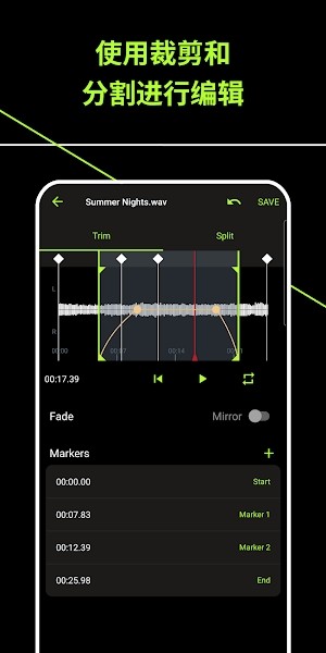 2. 提供多种编辑选项,包括修剪、拆分、可调节淡出曲线与标记功能;