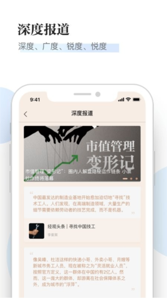 经观应用不仅是商业人士职业生涯的得力助手,更是一个以原创为特色的财经资讯聚合平台。它为商务人士筛选出有价值的信息,并以理性与建设性的态度推动形成更好的商业环境。经观app拥有强大的原创采编团队,深入到财经专业领域的核心地带,挖掘新闻背后的真相,为用户提供独特见解。