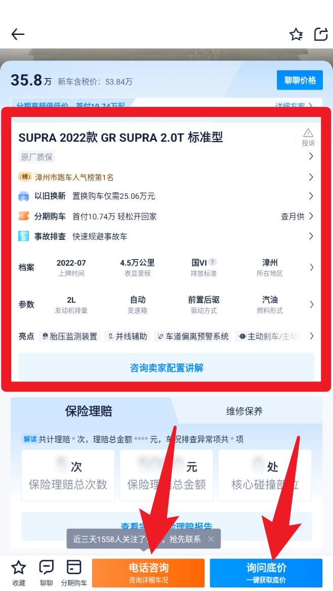 2. 在车源详情页中可查看车型亮点、估价、事故排查及档案参数,下方还能点选电话咨询或询问底价联系卖家。