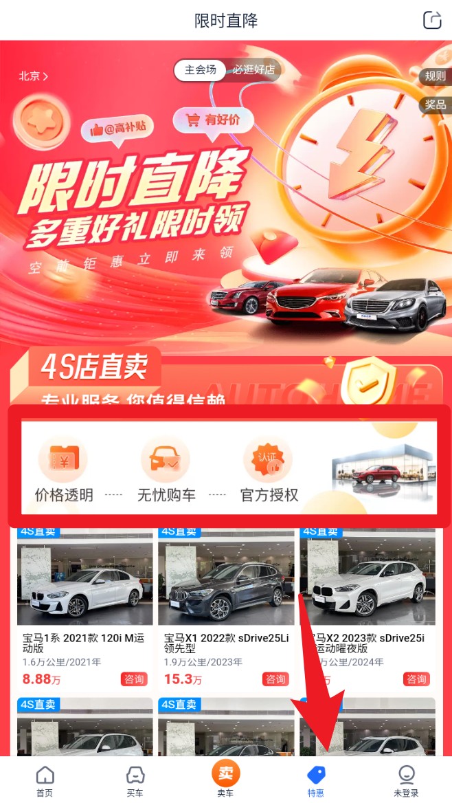 5. 在特惠频道可浏览限时直降、4S店直卖等促销车源,享有价格透明、官方授权、无忧购车等多项服务保障。