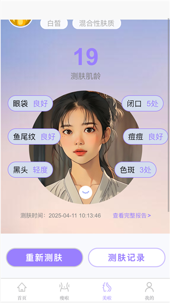 软件为用户提供拍照测肤的工具,拍照上传脸部照片就可以测试用户的皮肤,展示肤质报告。