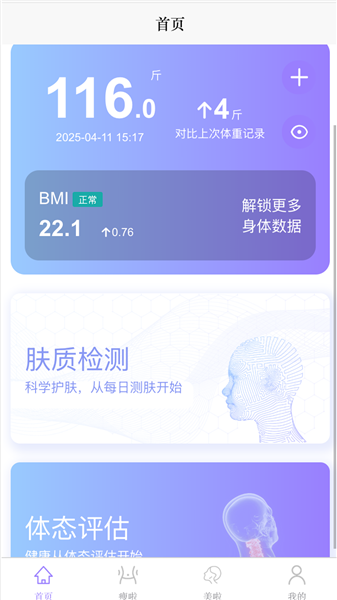 用户可以持续关注肤质、体重以及BMI等数据,从而能够实现全方位的健康管理;