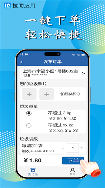 对于那些工作忙碌、生活节奏快,不想丢垃圾的用户来说,拉助 APP 的下单流程极其简单。无需复杂的步骤,让用户轻松摆脱垃圾处理的烦恼。