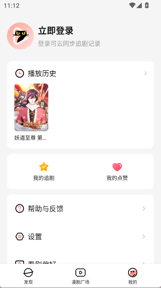 3、在“我的”界面查看播放历史,进行登录和设置