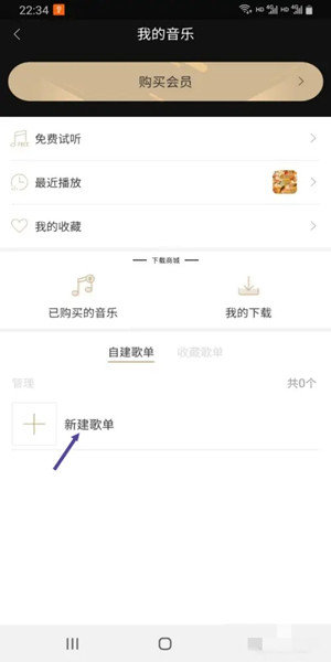 2、点击屏幕上的“新建歌单”按钮。
