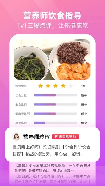 你上传的饮食记录,都可以获得营养师的专业点评,以及为你提供的专属的优化建议,帮你调整饮食结构,养成健康生活习惯。