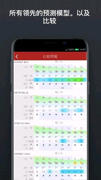 2、多种预报模型:GFS、ECMWF、WRF8、AROME、ICON、NAM、Open Skiron、Open WRF、HRRR。