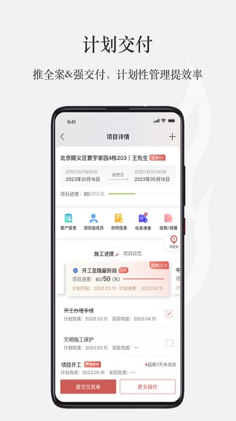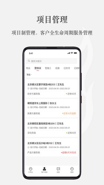 3、覆盖装企客户转化、服务签约、设计交付、施工交付、供应链协同等环节的家装务全流程应用。