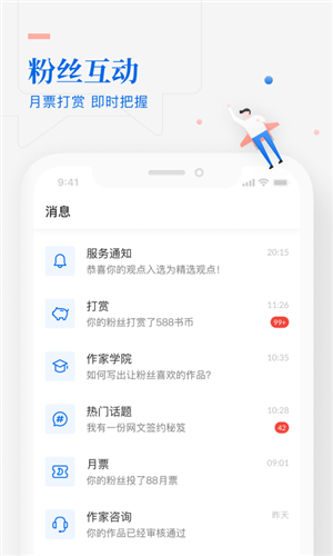 - 作品动态:实时获取打赏、月票、书评消息,随时掌控作品动态