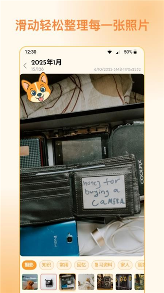 照片狗是一款智能相册管理软件,它能够自动的扫描相册,精准识别重复照片、相似图、模糊图等,同时也会筛选出大型视频、无用短视频生成清除建议,用户可以选择性删除或者是一键删除。系统采用的是左滑删除、右滑保留、上下滑对比的手势操作,可以像刷短视频般轻松筛选,提升整理效率。它还可以对相册进行分类可按人物、场景、时间等自动分类或手动分类照片。