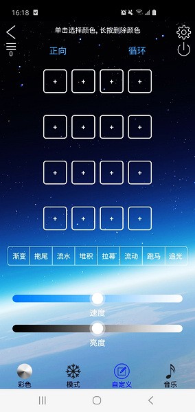 3、LEDLAMP为灯光提供自定义模式选色,内容丰富且灵活多变同时支持速度和亮度调节;