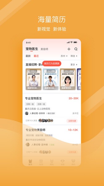 4、视频招聘:上传企业视频,吸引更多求职者青睐!宠物店和宠物医疗企业可查看求职者实地操作过程,更了解求职者的实力!