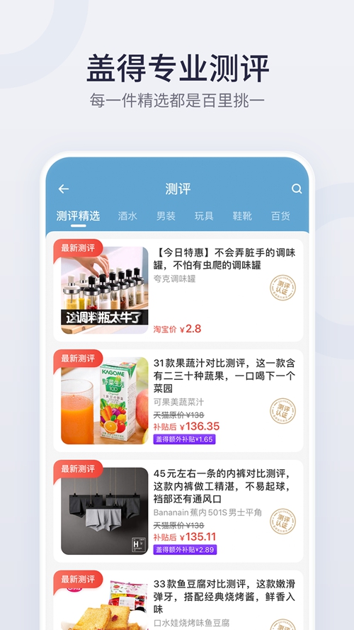 2、测评:以实验室检测+NPS等方式测评线上线下各大平台高频消费品,遴选出优胜者,已上线数千款测评商品。
