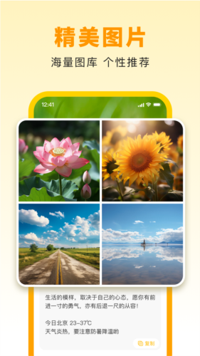 提供提醒服务的同时,每天会为你专属定制打卡图、问候语、节日壁纸等海量素材,可一键可分享至朋友圈、社群,和朋友互道早安,一起变更好。