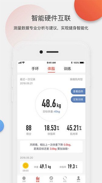提供个人各项指标数据采集汇总分析的能力,并通过个人数据分析更为精准的定制符合自身的健身训练课程,让您的健身更为高效与科学。
