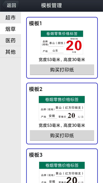 支持模版管理,有各种标签模板,可以看见尺寸;