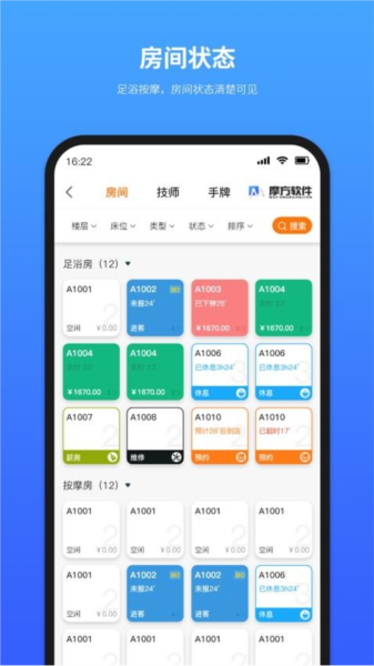 1、房间状态管理: 摩方软件展示了门店房间的实时动态,商户可以在线管理分配顾客的房间,确保房间的合理利用。