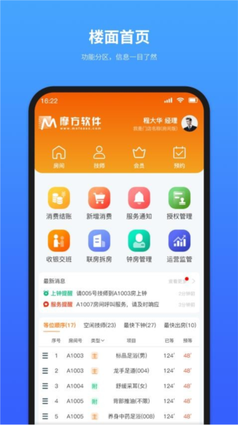 4、详细功能分区: 摩方软件设有多种功能分区,如消费结账、服务通知、钟房管理等,用户可以根据需要轻松选择使用。