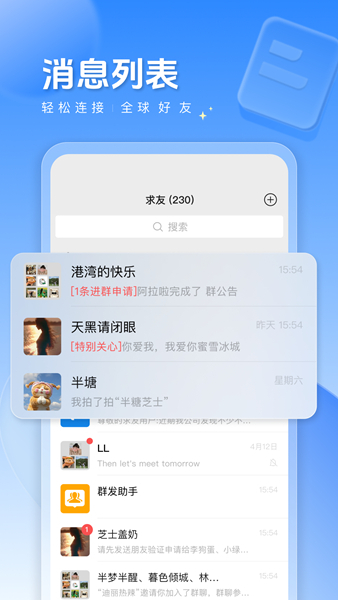 求友是一款专为沟通设计的即时聊天应用,让您随时随地与朋友保持联系,分享生活点滴,发现更多志趣相投的朋友。无论是单人聊天,还是活跃的群组互动,求友都能为您提供流畅便捷的使用体验。