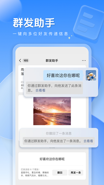 3、为了提升用户的聊天体验,APP还提供了群发助手功能用户可以轻松创建群发消息,一键发送给多个好友。