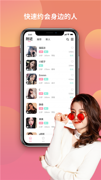 优先给你推荐附近的优质用户,你可以看到对方的实时距离和最近的登录时间