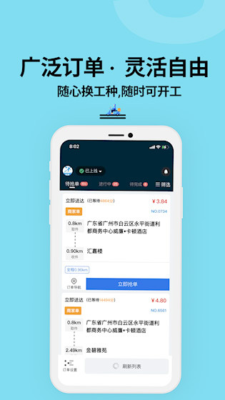 采用抢单模式,骑手可根据自身时间安排随时上线接单,无固定班次限制,适合兼职或全职使用,实现工作与生活的自主平衡。