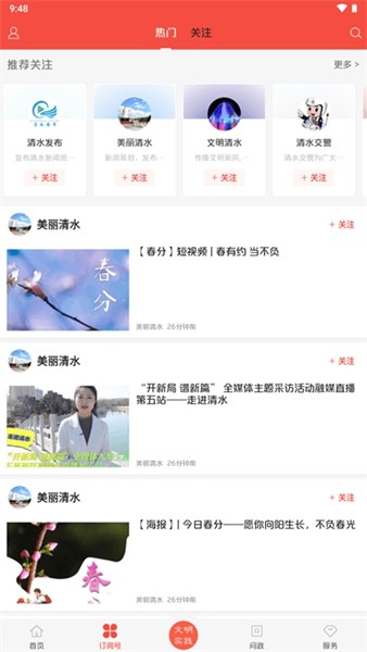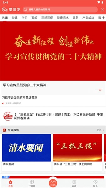 爱清水是清水县融媒体中心精心打造的以"新闻+党建+政府+服务"为一体的第一新闻客户端,发布权威信息、服务百姓生活,更及时、更准确、更全面讲述清水好故事、传递清水好声音、树立清水好形象。用户可以通过爱清水查看最新的各类行文资讯并且学习到很多关于党的讲话、党的思想,也有很多生活、趣闻类型的资讯,满足各类用户的兴趣。感兴趣的小伙伴快来下载爱清水体验吧!