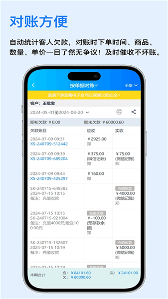 可设置会员等级,不同级别不同折扣价、可设积分活动,下单可使用积分抵扣,提高会员粘性,支持预存款充值,帮助商家快速回笼资金!可录入会员期初欠款,记账不丢失,可打印,对账无争议!会员下单有历史记录查询,消费喜好能掌握。