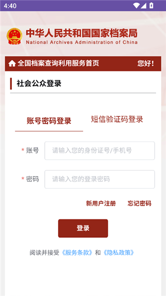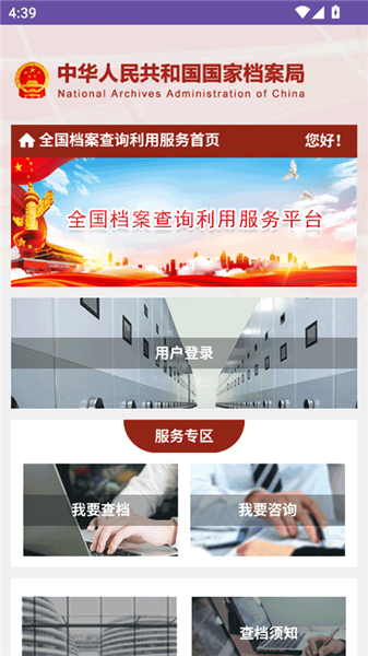 功能布局清晰,以卡片形式呈现“我要查档”“我要咨询”等功能,信息直观呈现,利于快速上手。