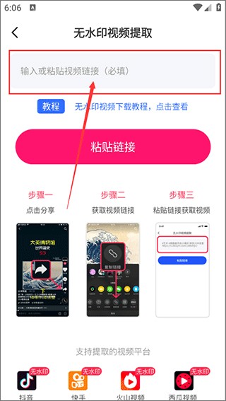 4、将复制的短视频链接粘贴至对应输入框,即可提取无水印视频。