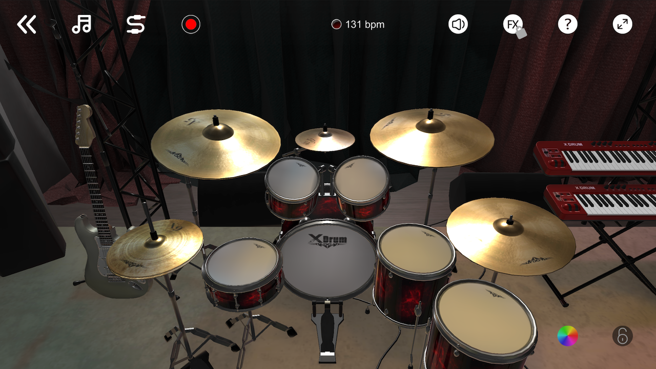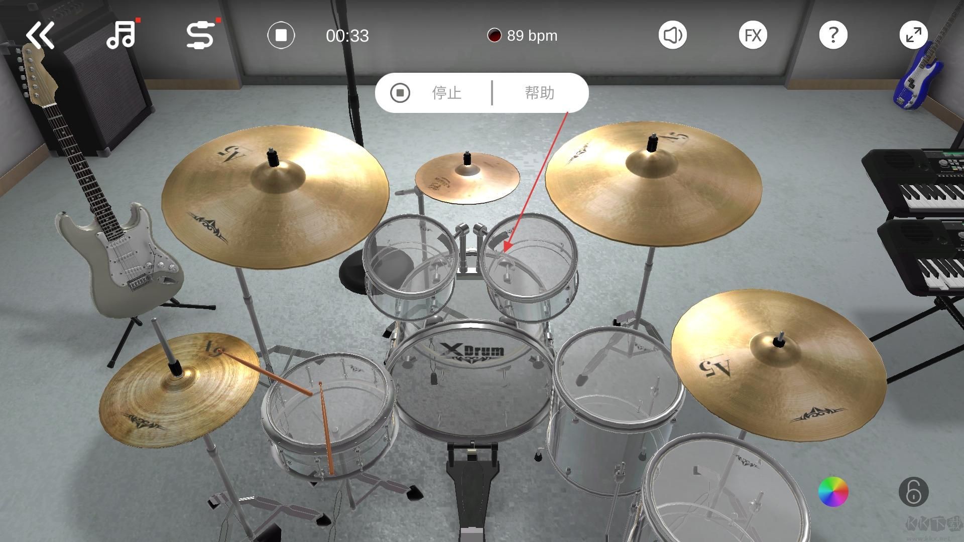2、选定模式后在演奏界面操作虚拟鼓组,可搭配吉他等乐器,调整节奏类型,沉浸享受表演;