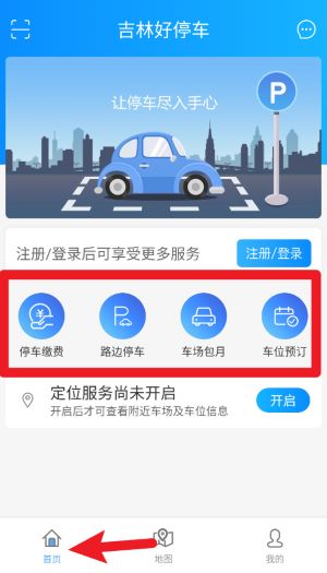 2、登录后进入首页,可点击对应图标进入停车缴费、路边停车、包月管理和车位预约等功能模块。