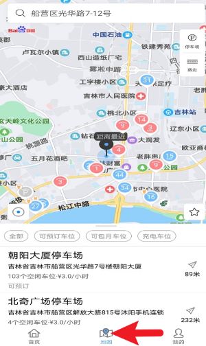 4、在地图页面启用定位功能后,可精准查找当前位置附近的停车场及空闲车位信息并快速导航。