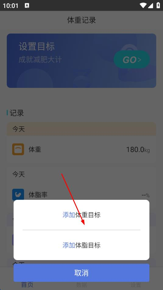 2、在弹出的选项列表里,选择 “添加体重目标” 选项;