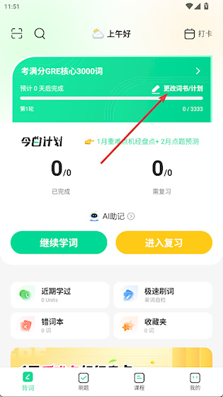 1、在背词界面点击更词书/计划