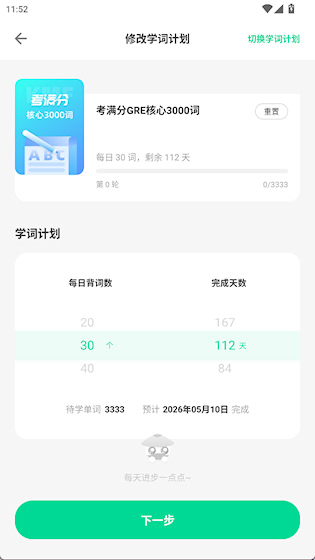 2、点可以设置每天背词数或完成天数
