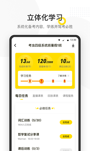 在线直播:跟着考虫的老师直播学习实时互动,体验沉浸式学习;
